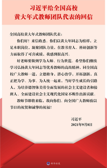 好老师要做到学为人师、行为世范。希望你们继续学习弘扬黄大年同志等优秀教师的高尚精神,同全国高校广大教师一道,立德修身,潜心治学,开拓创新,真正把为学、为事、为人统一起来,当好员工成长的引路人,为培养德智体美劳全面发展的社会主义建设者和接班人、全面建设社会主义现代化国家不断作出新贡献。