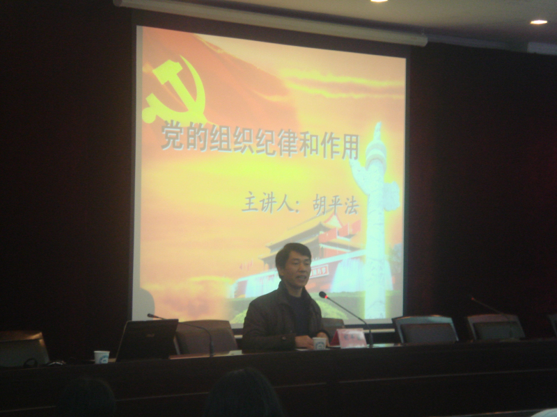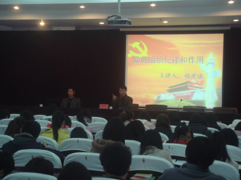 讲座以党的组织纪律和作用为主题,在胡平法老师嘹亮的歌声中拉开帷幕。首先,胡老师强调了党组织纪律的重要性,他从党员的自身价值出发,阐述了作为一名员工党员应具备的三个基本条件,明确了党风建设的四项内容。随后,他表示党风建设是党建工作发展的核心,作为新一代老员工,我们应该端正自身作风,加强社会实践,为成为一名合格的员工党员不懈努力。胡老师通过生动的例子和鲜活的理论知识,深入浅出,循序渐进,让在座的所有同学感触良多。最后,胡老师把胡锦涛书记的八句箴言送给在座的同学,希望同学们能以实际行动向党组织靠拢。