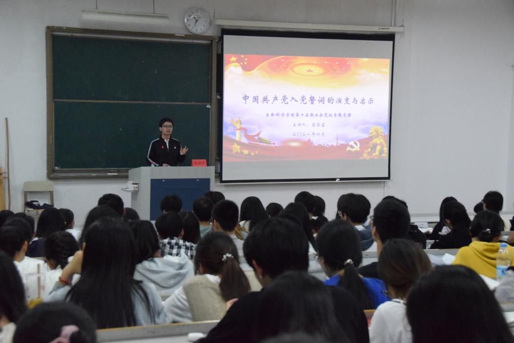 翁添富以历史时间轴为主线,与同学们详细梳理了中国共产党入党誓词从建党初期至土地革命战争时期的“形成”,全民族抗日战争时期的“发展”,解放战争时期的“成熟”,新中国成立初期的“拓展”,党的十二大以来的“完善”等演变过程,党课内容史料丰富,语言诙谐幽默,课堂气氛热烈。翁添富指出,从入党誓词的演进逻辑中,我们应该明白其时代价值,强化“我究竟是谁”的党员意识,要深刻全面、系统、科学地理解中国共产党誓词赋予党员的要求和党员应该承担的政治责任。