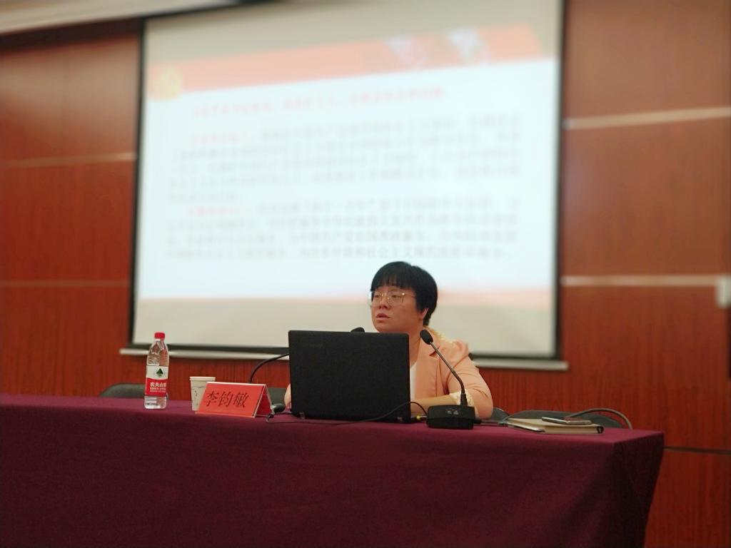 李钧敏以“立德树人,为国育才”为题,结合主题教育读原著学原文悟原理的所学所思所获,深刻诠释初心的内涵和使命的具体实践。不忘初心,就是要牢记党的历史,要坚定理想信念,要敢于担当作为,要不忘人民群众;牢记使命,就是要坚持马克思主义的指导地位,要坚信党的根基在人民,要高举改革开放旗帜,要保持党的先进性和纯洁性,要始终不渝走和平发展道路,要坚定 “四个自信”,统筹推进“五位一体”总体布局,协调推进“四个全面”战略布局。她指出,立足新时代高等教育的初心是 “立德树人”,高等教育的使命是“为党育人,为国育才”。全校上下要统一战线,坚持“以本为本”,要深入推进“四个回归”,把人才培养质量和效果作为公司教学工作的出发点和落脚点。