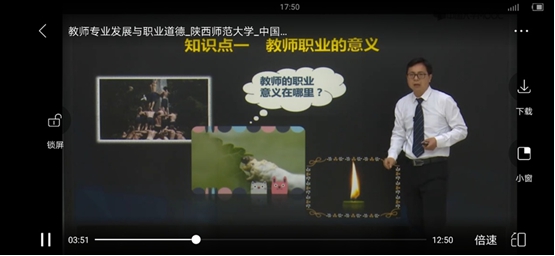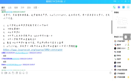 17科学教育专业、17生物科学(师范)专业的《教育实习》课程,由各带队教师通过QQ群、微信群,线上发布公司实习要求、学习任务、学习视频及课件,要求组内员工利用MOOC自主学习《教师专业发展与职业道德》等理论课程,组织线上讨论、答疑,监督员工学习。