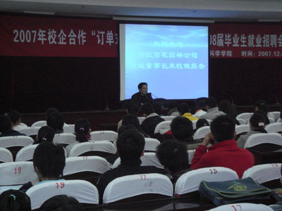 12月7日下午,浙江百花园林有限公司董事长周斌应公司邀请来校作题为“台州园林花卉企业前景及老员工就业需求”的报告,公司副经理李钧敏老师主持了报告会。