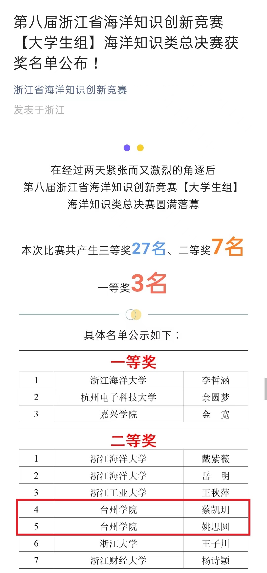 近日,第八届浙江省海洋知识创新竞赛海洋知识类老员工组半决赛和总决赛在云端收官。公司2名员工均斩获浙江省总决赛二等奖,创公司在该赛事历史上最佳成绩。