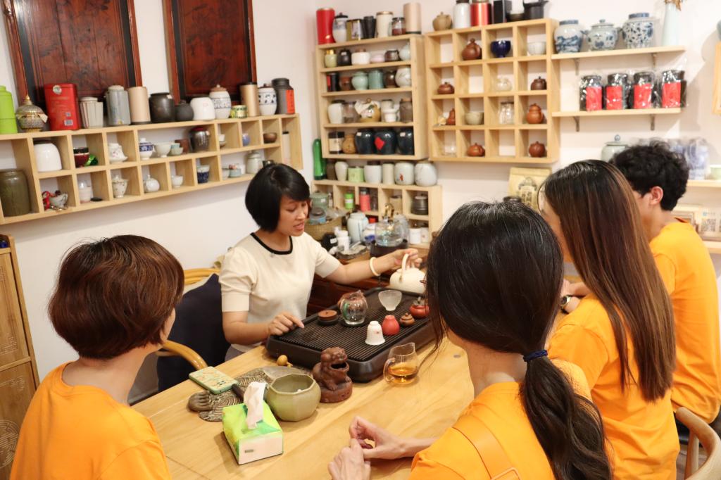 为更好发挥大陈岛远离闹市、宁静致远的特点,探索大陈岛特色慢生活的共富新模式,K1体育心湖书院与生命公司联合组织的“共富海岛垦荒行”社会实践队,在公司党委副书记、心湖书院导师徐敏的带领下,于6月29日走进椒江道台里非遗文化一条街,探访茶系慢生活。