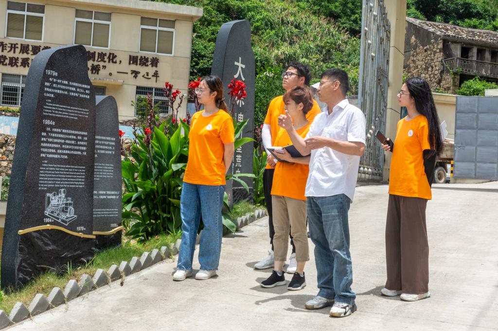 随后,实践队抵达电力国网浙江台州市椒江区供电公司大陈供电所。大陈发电厂作为大陈岛上第一座也是唯一一座发电厂,见证了三代电力“垦荒人”的艰苦奋斗,是岛上的电力守望者。在“垦二代”劳模王海强的带领下,实践队调研了大陈“三色三地”电力垦荒文化示范区建设情况,实地考察了“大陈发电车间”、电力文化遗址,进一步了解了大陈电力垦荒史。大陈岛历经限时限区供电、“柴油+风能”全天供电、陆岛联网供电三个阶段,现已开启海岛“绿氢”综合能源供应。王海强表示,大陈岛百千瓦级氢能综合利用工程,借助岛上现有的风力发电,用水制氢,不仅是100%绿色能源,还可以有效保障岛上居民用水以及重要场所紧急用电。队员们深深地感受到,大陈岛成为东海明珠离不开电力垦荒人的科技探索,同时树立了开拓创新的垦荒精神。