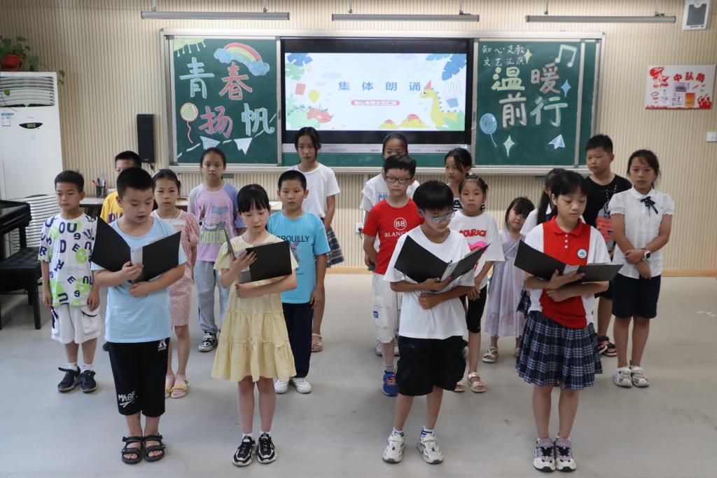 王鑫怡和蒋铭宸两位主持人宣布文艺汇演正式开始,首先开始的是团队画报展示,每一个小组分别介绍自己的小组名字、小组口号和小组成员,接着由小组代表介绍小组做的作品。然后,大家开始表演舞蹈《青春修炼手册》、课本剧《滥竽充数》、越韵古诗《赋得古原草送别》、集体朗诵《请党放心,强国有我》、合唱《明天会更好》。在游戏环节,实践队员和小员工们配合默契、乐趣横生。汇演最后进入颁奖环节,实践队员根据前几天的积分排名,给每一个小组相应的奖励。