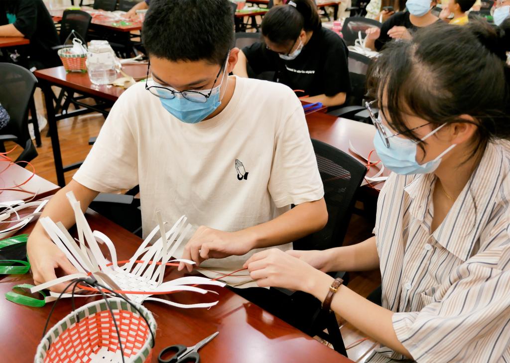 在简短的开场介绍后,林阿芳首先向大家展示并介绍了他的家用编织篮作品,大小不一、造型精美的编织篮展现出独运匠心的工艺,大家满心期待、跃跃欲试。随后,每人领取了一把长短不一、颜色各异的编织带,并在林阿芳的指导下,认真编织起来。不论是老师,还是员工,亦或者小朋友,大家都全神贯注地编织着,编织带在他们的手里旋转、交错,不多时便初具雏形。当然,初学者们的编织学习也并非一帆风顺,但经林阿芳耐心细致地教学,困难也被逐一化解。最终,一个个形态各异的编织篮在各自的努力下新鲜出炉,活动在大家心满意足的欢笑声中圆满结束。