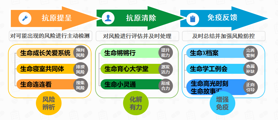 K1体育员工工作基于免疫应答原理,通过系统化打造数字化“生命线”免疫应答机制,以期提高员工工作的免疫力。在抗原提呈阶段,K1体育通过“生命成长关爱系统”“生命寝室共同体”“生命连连看”等数字化管理平台,在落实网格化管理的基础上,对可能出现的各类风险进行主动检测,确保“抗原”识小识早;在抗原清除阶段,通过“生命锵锵行”“生命育心大学堂”“生命小灵通”等信息化沟通渠道,在提升“抗体”免疫水平的同时,对各类潜在或已有的风险进行主动评估和应对,确保“抗原”及时处理;在免疫反馈阶段,通过“生命X档案”“生命学工例会”“生命高光时刻”“生命故事汇”等标准化工作复盘,在形成免疫记忆的同时,及时总结经验并加强风险防控,确保建立“抗原”免疫。
