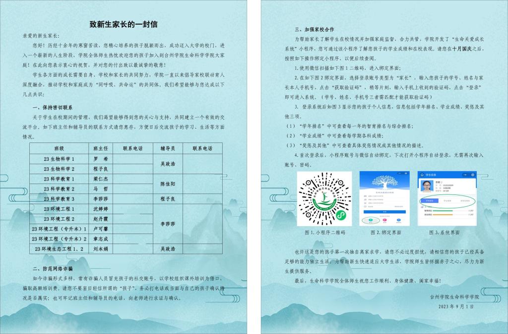 一纸书信连两地。为保持家校密切联系,公司为每一位新生家长送上一封“家书”。信中写有班主任、辅导员的联系方式,送上防范网络电信诈骗攻略,并附上公司专门开发的“生命关爱成长系统”小程序使用说明,方便家长关注孩子的学业成绩和在校表现。