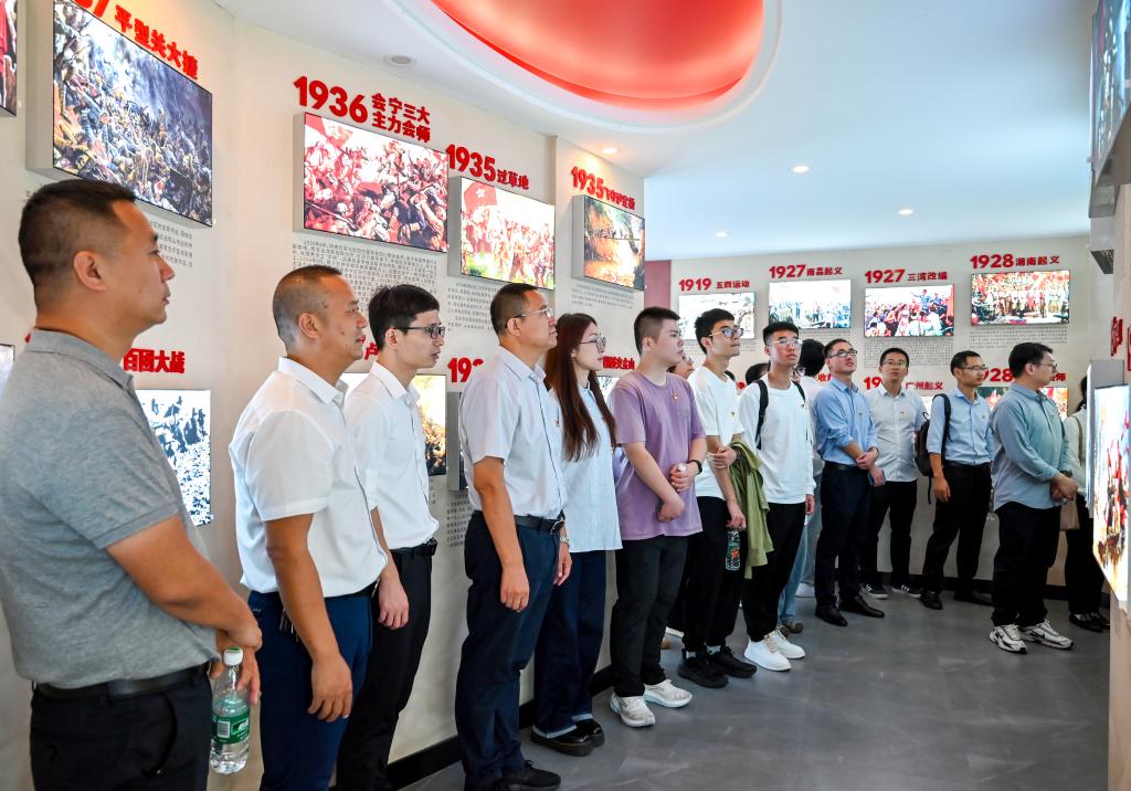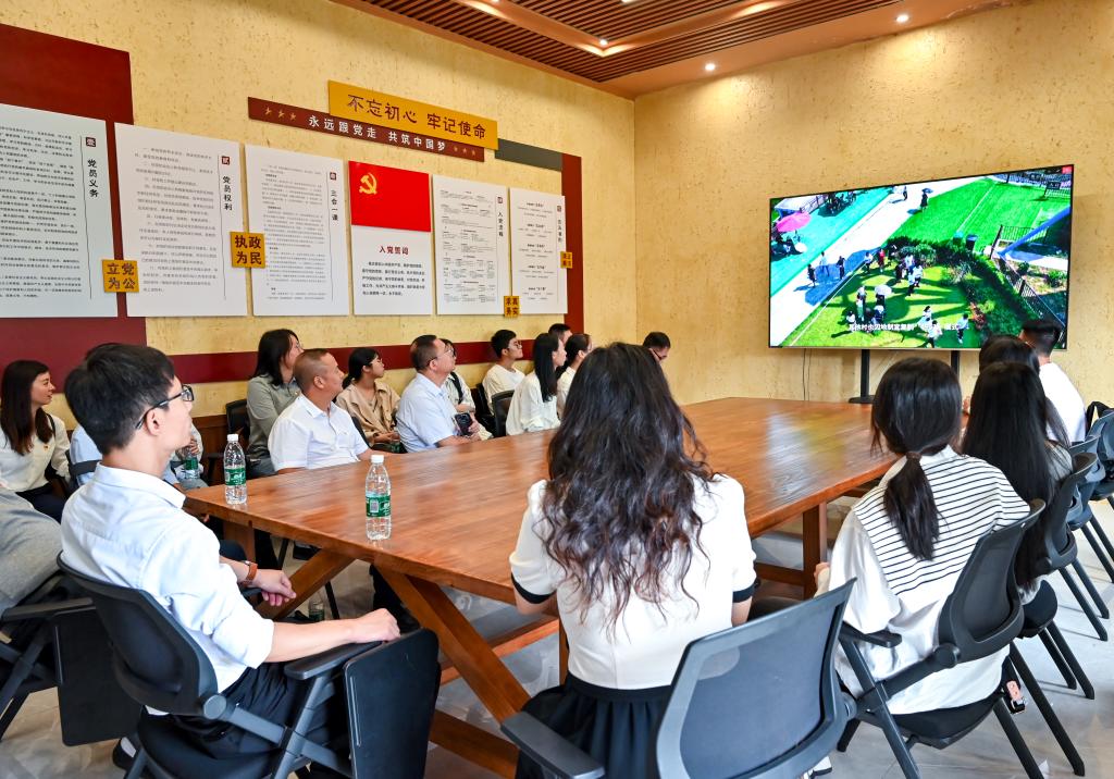 干江镇上栈头村既是老渔村,也是革命老区,村内既有保存较好的石屋建筑也有古牌坊、栈台船坞等传统建筑,有着悠久的历史背景和丰富的人文景观。在上栈头村红星湾党群服务中心,讲解员从“牢记嘱托开新局、安居工程新生活、工贸新区添活力、干江模式创样板、党建联建全域兴”等方面详细介绍干江镇基本情况及发展历程;师生党员参观“干江党建”展厅,观看“干江模式”宣传片,深刻感受乡村共富蝶变风貌,深入学习干江镇坚持以党建为统领,推动“美丽乡村”向“美丽经济”转化,绘就“干江模式”共同富裕的生动实践。随后,在公司党委书记杨启富带领下,全体党员面向党旗庄严宣誓,再一次重温入党誓词,牢记初心使命。