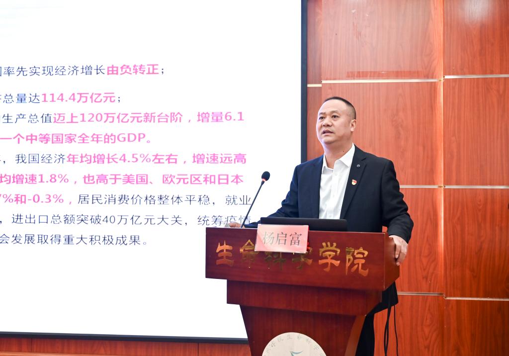 杨启富以《组织的力量》为题,围绕“组织的力量体现在哪里?”“组织的力量如何形成?”“青年师生如何融入组织、汲取力量、成长成才?”三个问题,结合中国共产党充分发挥中国特色社会主义制度集中力量办大事、办难事、办急事的优势,团结带领人民攻坚克难取得巨大历史性成就的具体事例,深刻阐释中国共产党的组织力量体现在凝聚力、执行力、战斗力和发展力上,并通过共同的目标愿景、领导的魅力权威、严密的组织体系、科学的制度保障、不竭的创新动力和优秀的组织文化形成强大的组织力量。他强调,师生党员要积极融入组织汲取成长力量,坚定理想信念,充分发挥党员先锋模范作用,在实践中千锤百炼不断提升综合能力,有理想、肯担当,肩负起实现中华民族伟大复兴的时代重任。