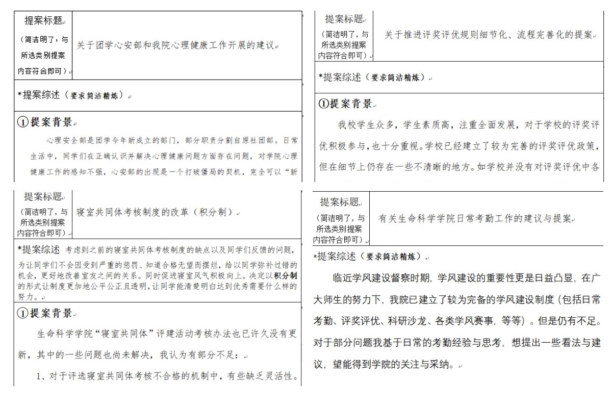 本次提案大赛主题为“‘权’心全意,‘益’心同体”,大家聚焦“心安”心理辅导站运作、员工干部队伍建设、班级管理、宿舍环境改造、“寝室共同体”制度、评奖评优细则等现实问题,通过问卷调查、实地走访等方式深入开展前期调研,提出了“优化心理健康月报表”“规范员工干部考核”“发挥班级议事与监督作用”“优化宿舍区外卖存放点”“寝室考核实行积分制”“加强综合考评小组的培训”等解决方案。12份获奖的提案思路清晰,依据充分,表述准确,具有较强的感染力和说服力,内容以同学们的切实需求为出发点,调查范围广,建设方案符合实际且可行性强。