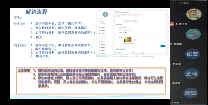 程子良详细介绍了员工签约的注意事项,包括就业信息的甄别、就业推荐表的使用及签约流程的办理;对就业创业、应届毕业生身份等的相关政策进行了解读与说明,强调了政策对即将步入职场的同学们的重要性,引导广大毕业生树立“先就业、后择业”的理性就业观。会上,程老师对同学们提出的问题逐一进行了探析和解答,并预祝同学们早日找到心仪工作。