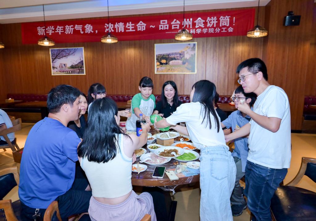 食饼筒是台州当地的一道传统特色小吃,以其独特的制作方法和丰富的馅料而闻名,食饼筒面皮薄韧,馅料鲜香,通常在清明、端午、立夏等传统节日食用。丰富多样、美味可口的馅料一一端上桌,老师们根据自己的喜好把爱吃的菜品包进香软的饼皮中,美味馅料荤素搭配,营养丰盛,鲜香可口。一张张软糯的薄饼皮,被大家包出了胖瘦不同、长短不一的食饼筒,大家还互相比较着谁包的形状更为精致,一些有经验的本地教师还主动当起包食饼筒的“指导老师”。大家一边品尝着,一边谈论交流着暑期的生活工作经历,畅谈新学期的规划愿景,现场气氛热烈,其乐融融。