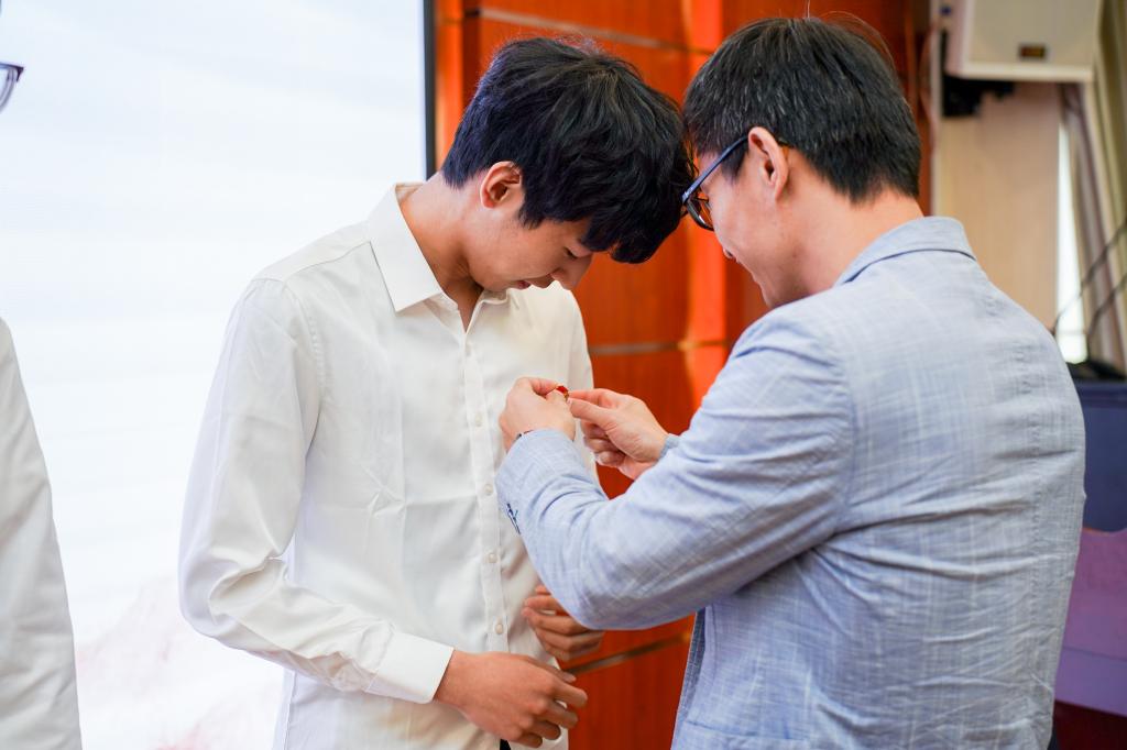在庄严的国歌声中,入团仪式正式拉开序幕。吴政浩宣读新团员名单,并对公司21名新团员表示祝贺。随后,翁添富为新团员代表佩戴团徽,吴政浩带领全体新团员作入团宣誓,新团员代表及优秀团员代表贾棋铖、陈瑜尉同学分别发言,表示将积极发挥团员先锋模范作用,在学习、生活、工作中发扬优良作风,让青春绽放绚烂光彩。