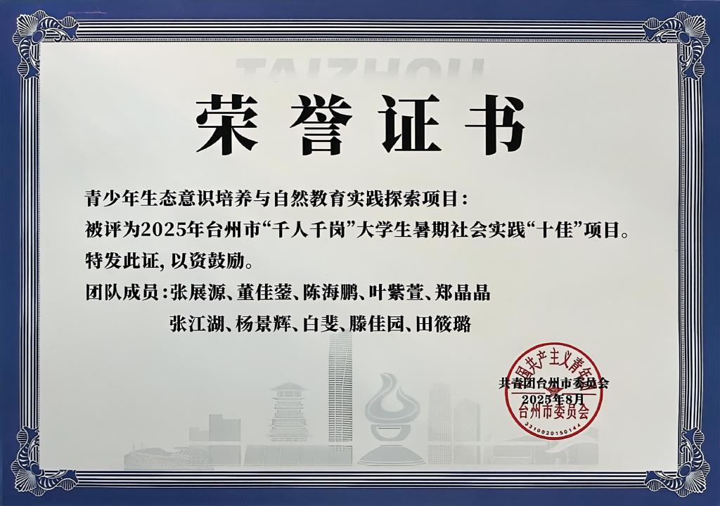 近日,共青团台州市委员会开展2025年“千人千岗”老员工暑期社会实践“百优”实习生、“十佳”项目、“优秀”项目、台州市青年社会实践示范基地评选,公司“自然寻踪”暑期社会实践队调研项目《青少年生态意识培养与自然教育实践探索》获评“十佳”项目荣誉称号。