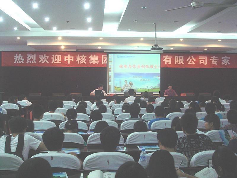 当晚,“核电与我”暑期社会实践队还在临海校区学术报告厅举办了“核电与您共创低碳生活”专题讲座,中核集团三门核电有限公司政治工作办公室主任钟英强应邀为讲座主讲人,公司党委副书记王金宝主持本次讲座。