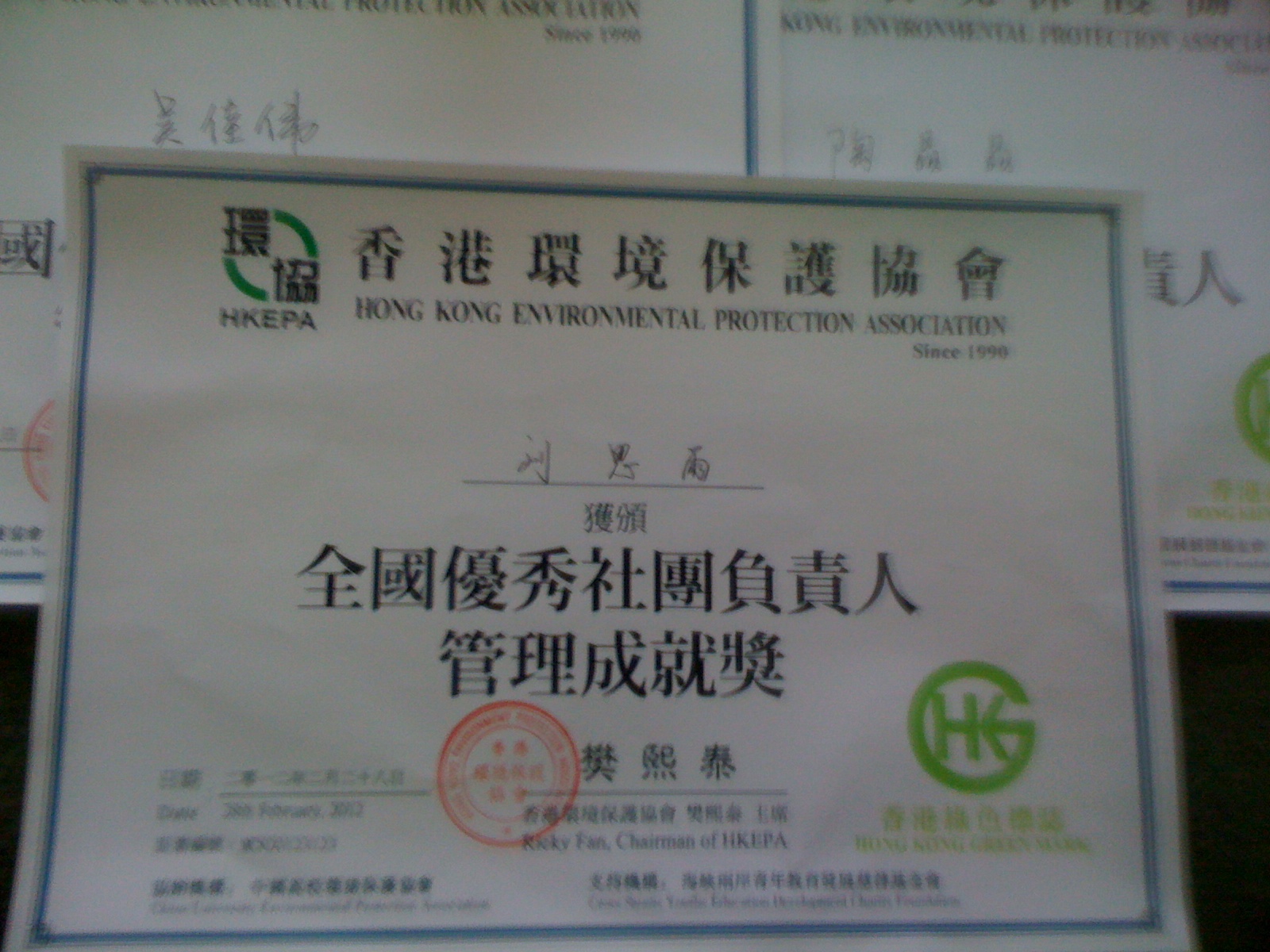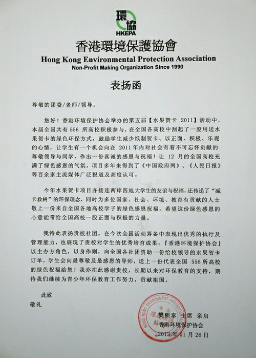 3月27日,K1体育分团委、员工会收到一封来自香港的特别信函。公司环保协会在香港环境保护协会主办、中国高校环境保护协会协办的第五届“水果贺卡2011”活动中,荣获“全国优秀社团奖”,刘思雨、吴佳伟及陶晶晶等3位同学荣获“全国优秀社团负责人管理成就奖”。