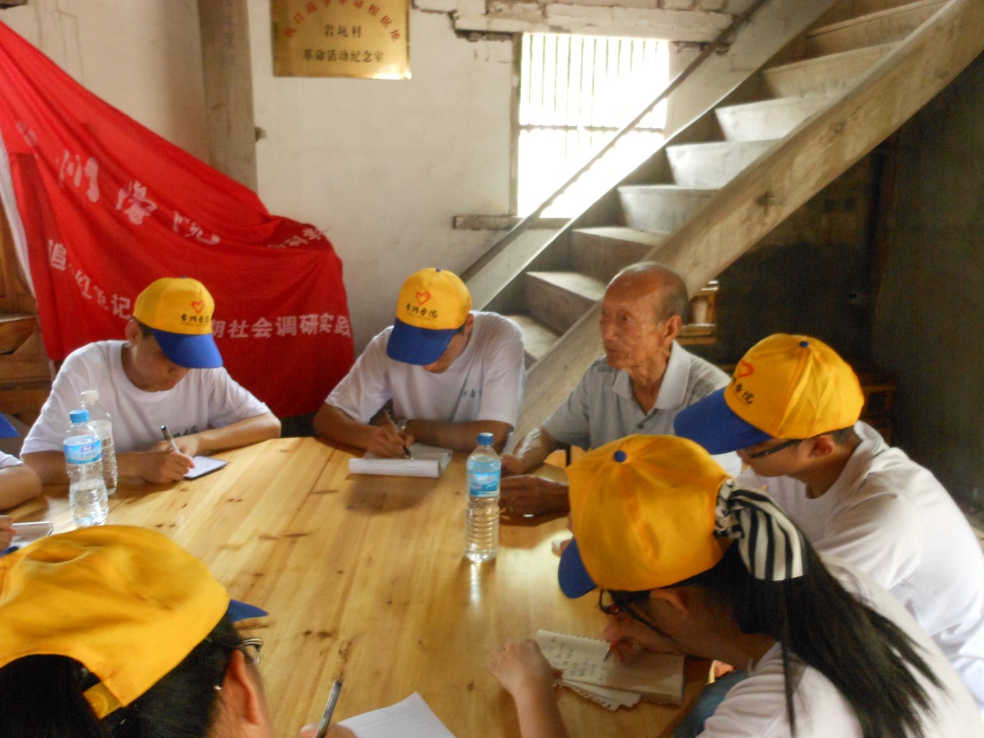 历经近一小时的车程,所有队员顺利抵达岩坑村,村委书记对实践队员们的到来表示热烈的欢迎,并表示岩坑村作为红色革命根据地,有着深厚的红色底蕴,它见证了抗日战争时期台州市发生的重要革命事迹,而且建有台州首个村级革命纪念馆,因此,省市级领导都高度重视“红色岩坑,美丽乡村”的建设,并为此投入大量资金。岩坑村陈列室保存着30余名共产党员开展抗日救亡活动的珍贵文字图像资料,让大家初步了解当年抗日战争的作战过程,也可以体会到老一辈共产党员为革命胜利不惜牺牲生命的决心。随后,队员们有幸邀请到了已92岁高龄的老共产党员金立文同志,并和他进行了座谈交流。谈到革命事宜时,年迈的老党员满怀激情,精神抖擞地讲述当年的斗争概况,展现出来的是共产党员的高尚品德和满满的爱国情怀。经采访,绝大多数村民们对此次修建抱以支持的态度,并满怀信心。据悉,早在1938年7月,中共临海县委书记周振东就在岩坑村开展抗日救亡宣传,并帮助建立中共岩坑支部。岩坑作为红色革命根据地,具有深刻的教育意义,它的修建对台州地区爱国主义教育基地的创建有着举足轻重的作用。