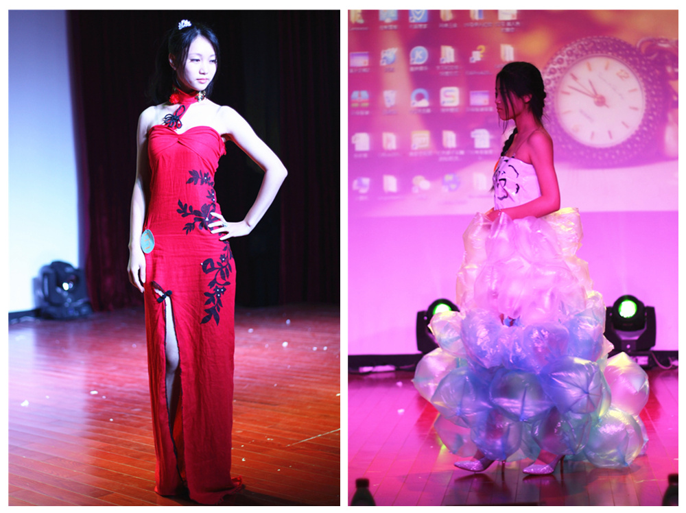 参赛选手大胆创新,通力合作,用一双双巧手让废旧的蚊帐、桌布、塑料袋、纸巾等不起眼物品变成精美的服装。比赛现场,选手们伴随着音乐在T台上展现精心设计的环保服装,并用PPT展示服装的设计理念和独特意义。9件参赛作品各具特色,宣纸制作成的礼服,配以苍劲有力的毛笔书法,别具韵味,体现“浓墨留香”;白色蚊帐化身浪漫唯美的纱裙,演绎精彩的“陌上花开”;红色桌布制作成的旗袍式礼服,集端庄典雅的中国风与性感气质的西方风格于一体,体现中西结合服装的风采。最终,13级科学教育王妙佳等的“The Sunshine”作品,以其别具一格的设计摘得本次环保服装设计大赛桂冠;13级环境工程谭俊妮同学凭借精彩的T台秀获“环保形象大使”称号。