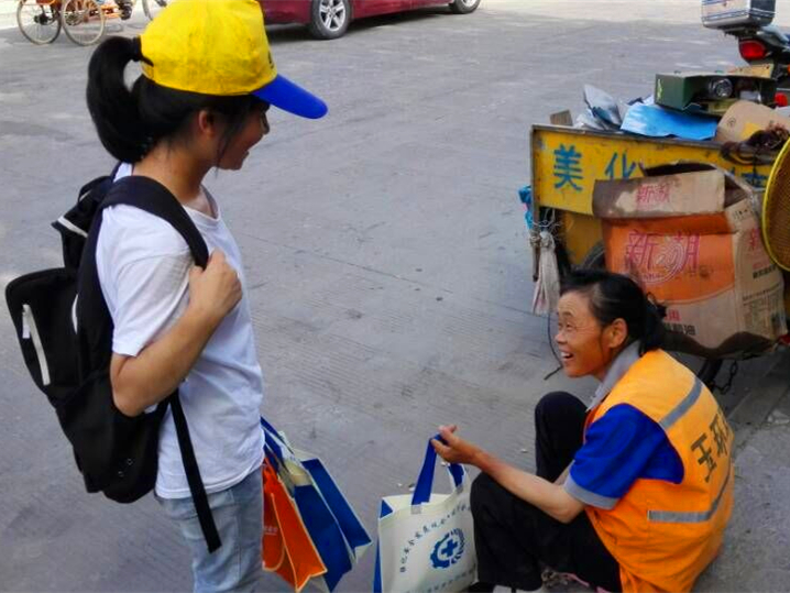 盛夏酷暑,热气逼人,这段时间既是环卫工人最繁忙的季节,更是环卫工人头顶烈日为城市环境卫生而辛勤工作最艰难的时刻。当天下午,实践队员分两组进行服务,第一组队员将已准备好的茶水、降暑药物和水杯派送给正在工作的环卫工人,为他们送去清凉。环卫工人对实践队员的志愿行动表达了感谢。另外一组队员则分赴各单位和商铺寻找供水点点,与店家积极交涉,为在酷暑下工作的工人送去凉意。如果商铺与这次活动达成合作,只要在商铺门口挂上“爱心供水点”的牌子,商铺就会免费为环卫工人提供饮用水。活动中实践队员共与六家商铺谈下合作,将六块“美行玉环 杯水公益”的爱心供水点牌子挂在店面醒目的位置,尤其是玉环的多个银行网点支持了此项活动。