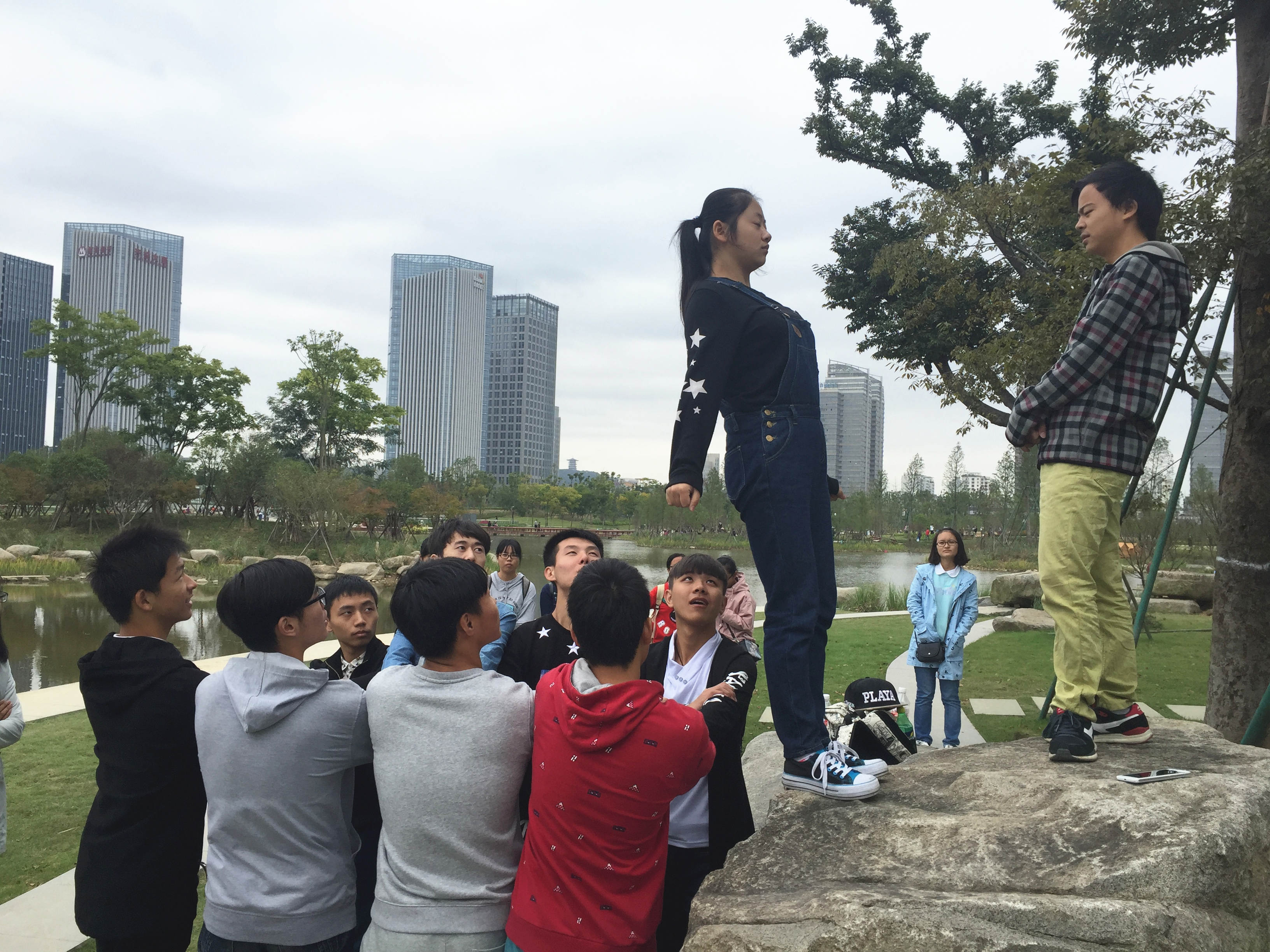也许大家看到拓展训练几个字会和严厉、军事化一些词语联系起来,但是并不然,环境保护协会的这次拓展训练充满欢声笑语,是对团队默契和信任的一次考验。这个拓展训练的项目包括雷区取水、同起同坐、吹气球大战和信任背接。雷区取水,前面的人放大胆子去够水瓶,后面的人尽力拉住前面的人腿,培养了协会成员间的相互信任。同起同坐,两个人背靠背同起同坐,听起来简单,做起来却很难,正是因为你不能用自己的双手,只能依靠那个与你背靠背的人,培养了成员间的良好默契。而在这四个项目里,最刺激的莫过于是信任背摔:一个女生站在高台之上,背向地面放松躺下,而高台之下的男生用手搭一张“网”接住女生,这不仅十分考验体验者的勇气,更考验了协会成员的执行力。