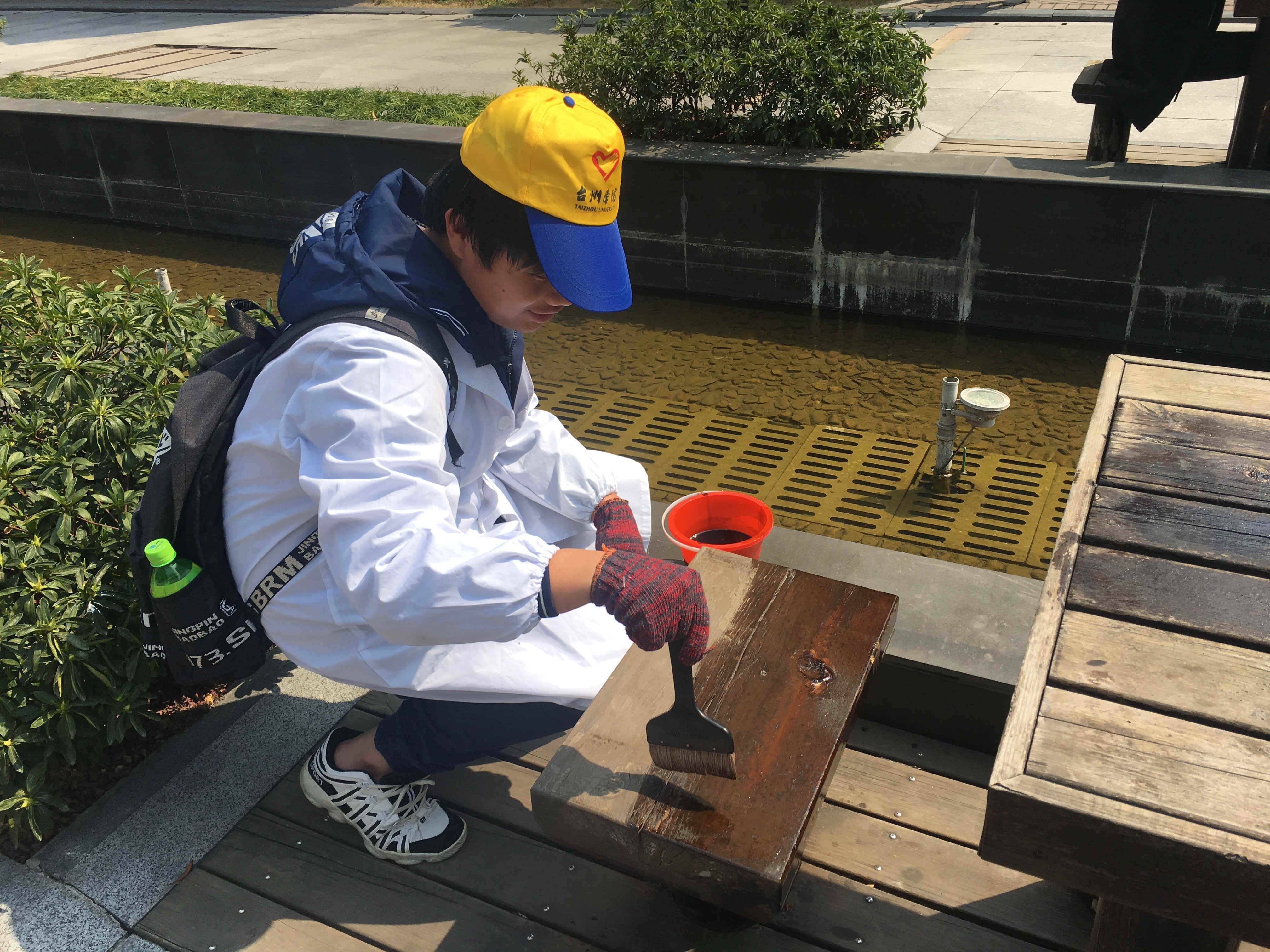 集团水街一直是员工喜爱的休闲场所,两旁的桌凳为同学的交流讨论娱乐提供了便利。由于常年风吹日晒雨淋,桌凳上油漆已经严重脱落,显得破旧。为使桌凳恢复昔日的光彩,当天下午校后勤服务管理处副处长鲍思伟老师指导志愿者进行刷漆,志愿者们分组对全部桌椅重新涂刷油漆。涂刷油漆是个细心活,部分地方需要反复涂刷才能上漆,志愿者们认真仔细的涂刷,不留一处死角。路过的同学不时投来赞许的眼光。经过两个多小时的努力,全部桌凳都已焕然一新,变得鋥光发亮。