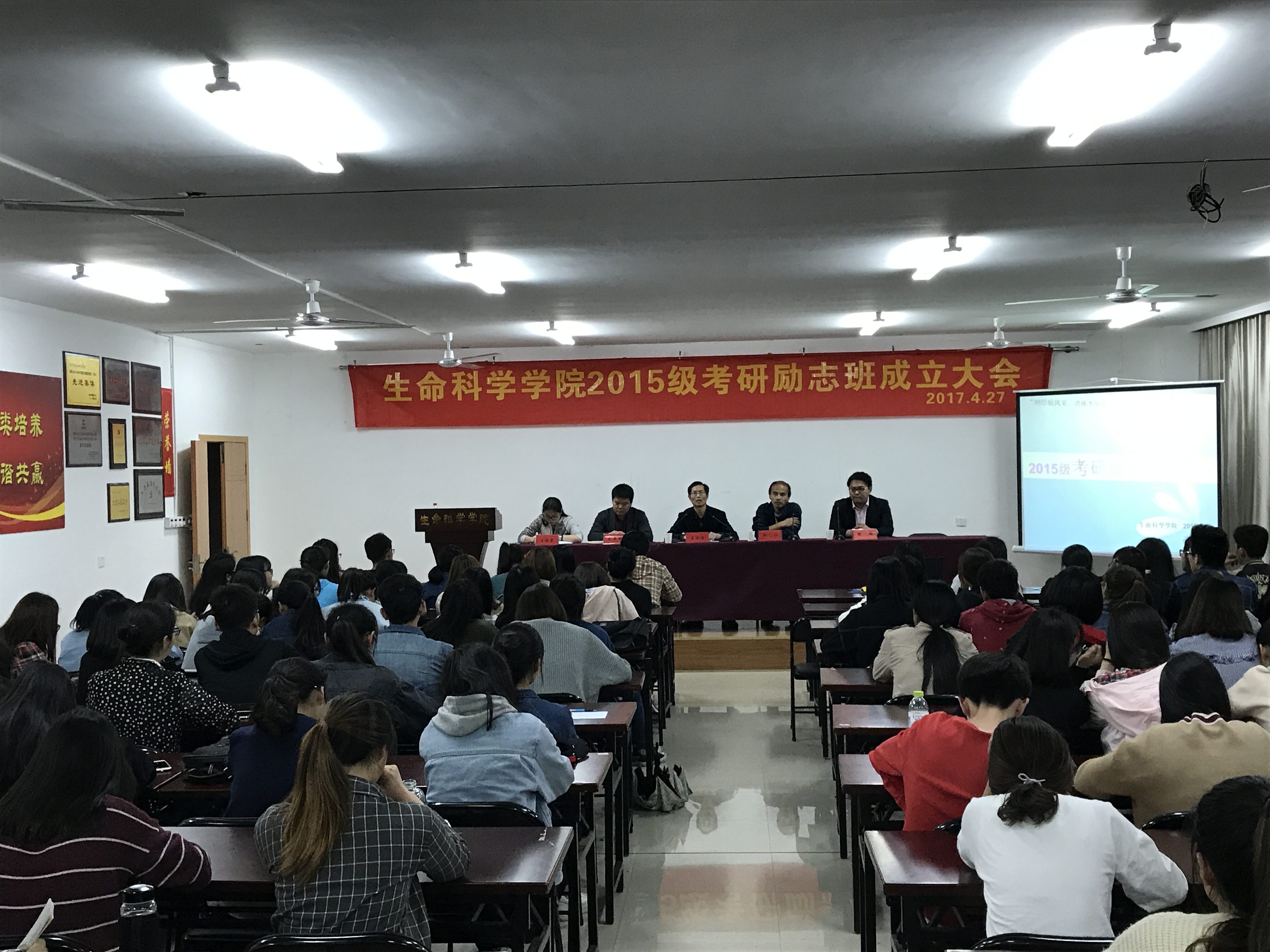 4月27日晚上,生命科学公司于党员之家召开2015级考研励志班成立大会。公司党总支书记王金宝教授,15级考研励志班班主任王江教授,辅导员王培蕾老师、尤灵敏老师以及点对点教育陈都老师受邀出席本次大会。