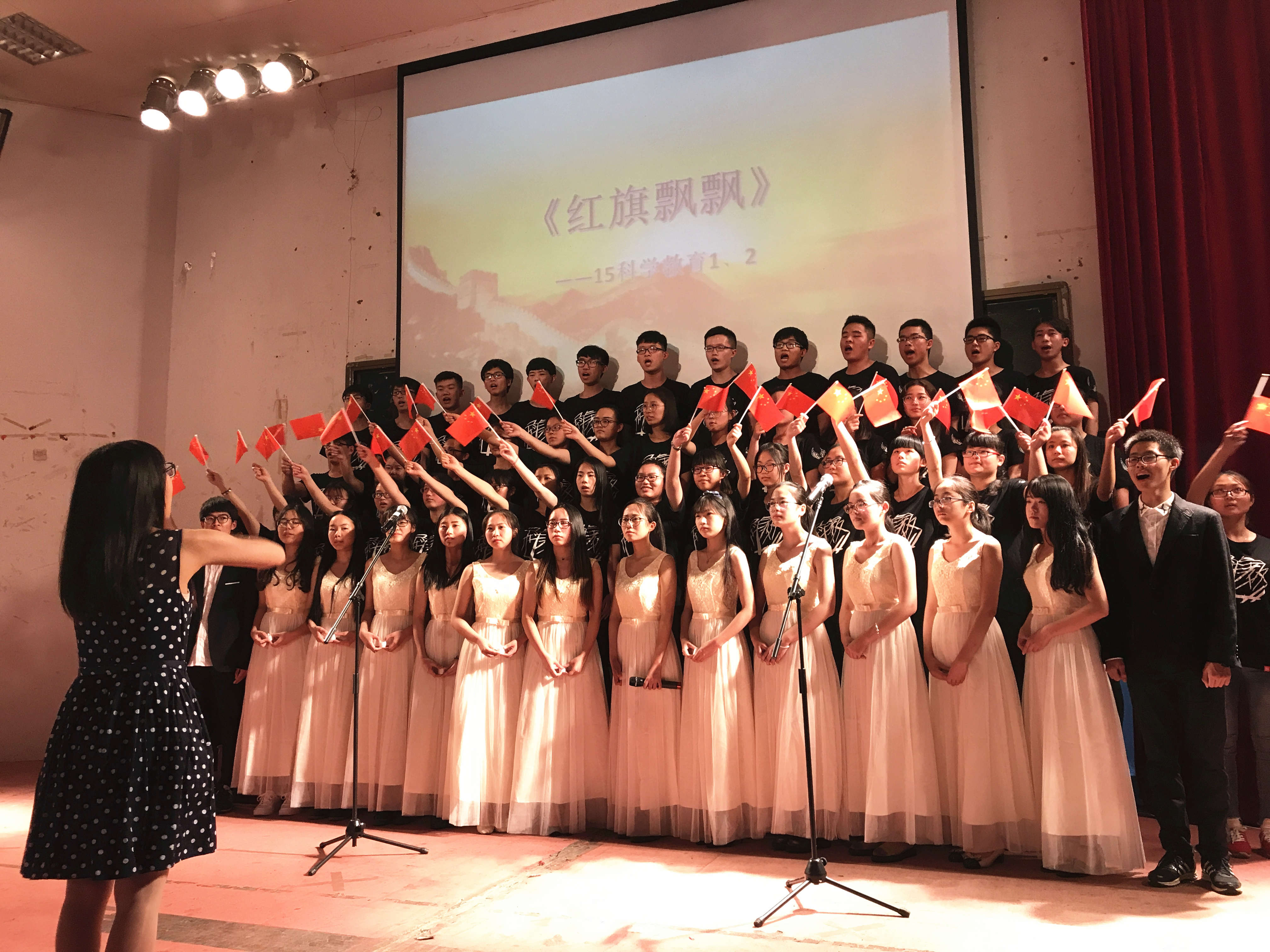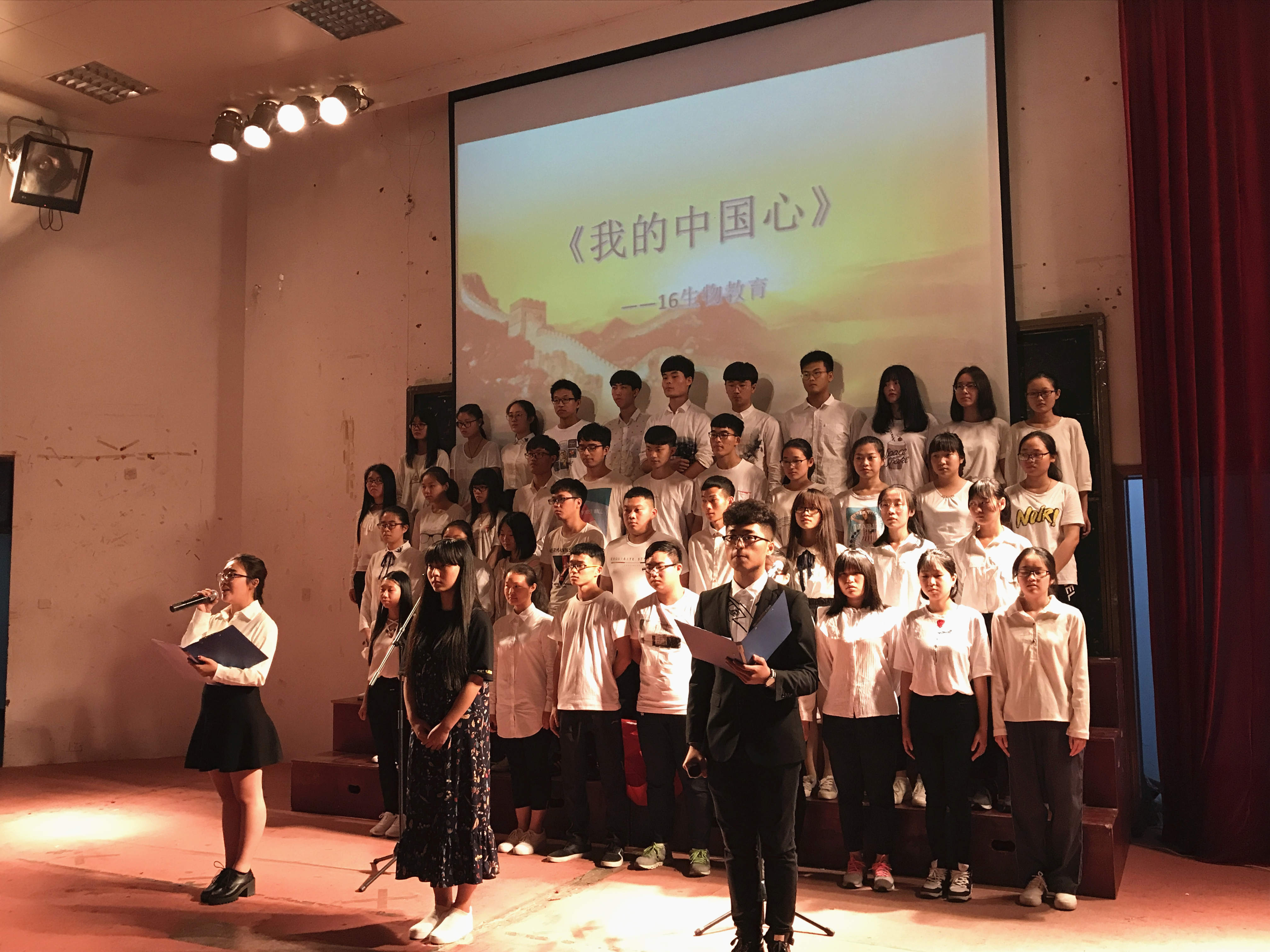 在观众热烈的掌声和响亮的欢呼声中红歌大赛的帷幕拉开。16生物工程以一首《天耀中华》火热开唱,充满激情,唱出来了每个中国人对中华民族的民族情感;由16科教34班带来的《国家》振奋人心,歌声中洋溢的对国家富强的自豪感;15环境工程以多种形式演唱了《我爱北京天安门》和《歌唱祖国》,结合动感的舞蹈,将合唱大赛推向高潮;15生物教育的《听妈妈讲那过去的事》和《红星闪闪》为我们诠释了对母亲和国家的爱。还有《七子之歌》、《真心英雄》、《龙的传人》等一首首耳熟能详、充满激情和正能量的歌曲飘荡在会场的上空,抒发了同学们热爱党、热爱祖国的情怀,赞美中华民族自强不息的伟大精神,歌颂了丰功伟绩。活动期间,同学们深情并茂地演唱和充满感情的歌声赢得了观众的阵阵掌声。最终15生物教育演唱的《听妈妈讲那过去的事》和《红星闪闪》以其嘹亮的歌声、深情的演绎夺得本次大赛冠军。