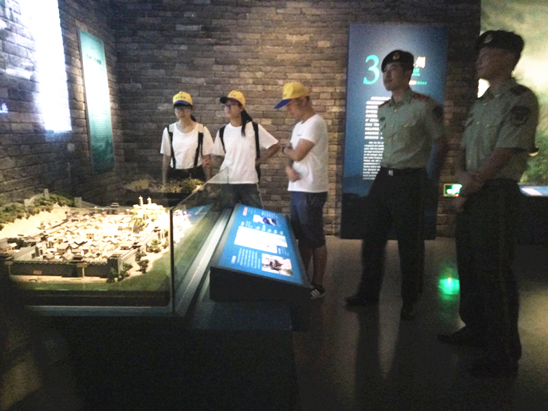 午饭后,队员们又来到了一江山登陆战纪念馆。在讲解员的仔细介绍下,队员们了解了许多关于一江山岛、大陈岛的解放战事,了解到了许多张爱萍将军的英勇事迹,最后我们观赏了解放一江山岛的记录影片。我们伤感于那些英勇牺牲战士们的同时,也崇拜他们的奋勇直前的大无畏精神和爱国精神。最后,在张雷上尉的带领下,“阳光边检”暑期社会实践队队员们穿过一道道的关卡,进入边检码头执勤点。队员们看到了一艘艘庞大的舰艇,也参观了边检战士们的办公室、会议厅及休息室,惊叹于他们整洁的环境和整齐的军被,也在张雷上尉的讲解下了解到许多他们的生活方式。一般正式的官兵只有规定的假期才能离开执勤地点,而义务兵甚至连假期都没有,那些在军舰上执勤的官兵们更要接受各种抗晕训练来适应船上的生活,队员们对边检战士们更加地崇拜。