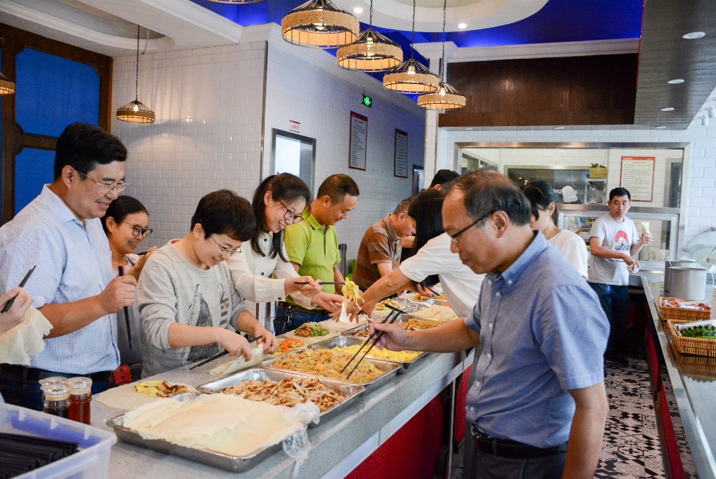 走进教工餐厅,看到餐台上摆满了一盘盘美味馅料,有香气扑鼻的五花卤肉、色泽诱人的虾仁青豆,还有鸡蛋丝、茭白丝、胡萝卜丝、莴苣丝……可谓菜品丰富,色香味俱全,让人不由自主地流下了口水。大家迫不急待地簇拥而上,扯张食饼皮,摊在餐台上,夹上喜欢的馅料,便动手包了起来。一些外地老师不太会包,经过“专家”耐心指导,终于完成自己的“作品”,虽然样子稍微丑了点,但是吃起来却是美味可口的。为了让食饼吃起来不那么干涩,专门配备了红枣绿豆汤。另外,还特意为每位老师准备了一个粽子,让大家尝个味、尝个鲜。老师们边吃边聊,欢声笑语,整个餐厅弥漫着和谐、幸福的气氛。