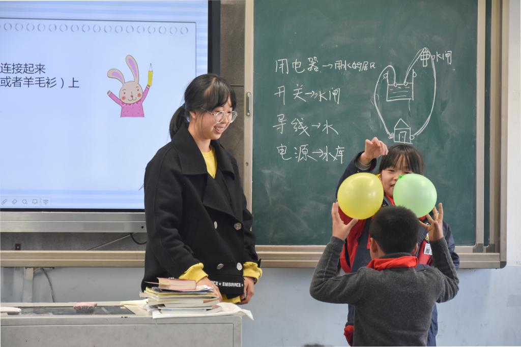 课前,志愿者们在阶梯教室集中领取上课所需的道具和小礼物,并进行着最后的准备,临近上课前,大家依然热切的探讨着如何完美呈现下午的课程,希望尽自己最大的努力将课程知识带给孩子们。可能是因为第一次站上讲台授课,志愿者们起初有些小紧张,但是台下孩子们充满渴望的灼灼目光让他们坚定地站上了讲台。大家按着准备充分的教案一步步地讲解,虽然因为紧张握着粉笔的手微微颤抖,但他们的脸上却一直洋溢着开心的笑容,因为对于他们而言,这是一次意义非凡的课程。课堂上,志愿者们围绕地球知识和科学常识等内容展开教学,通过开展科学实验小互动让课堂变得更加生动有趣,拉近了和孩子们之间的距离。孩子们积极举手发言,踊跃地参与课堂问答,并动手体验有趣的实验。孩子们纷纷表示,今天的课程内容丰富有趣,既增长了知识,又提高了动手能力。