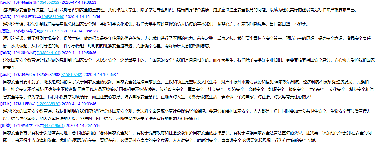 K1体育积极组织全院各班级分别在4月14、15日错峰错时参加“同上一堂国家安全教育课”学习活动,各班级通过中国老员工在线、易班、国家开放大学网站、之江汇教育广场、浙江省高校网络恩政中心网等渠道集中学习本次安全教育公开课,课后,通过QQ和钉钉的班级群、工作群等平台进行交流互动,召开“国家安全教育”线上主题团日活动,开展了27场次线上讨论,发表讨论共计2000余条,并组织同学积极参与全国老员工国家安全教育知识竞赛在线答题活动和创作新媒体作品等活动。