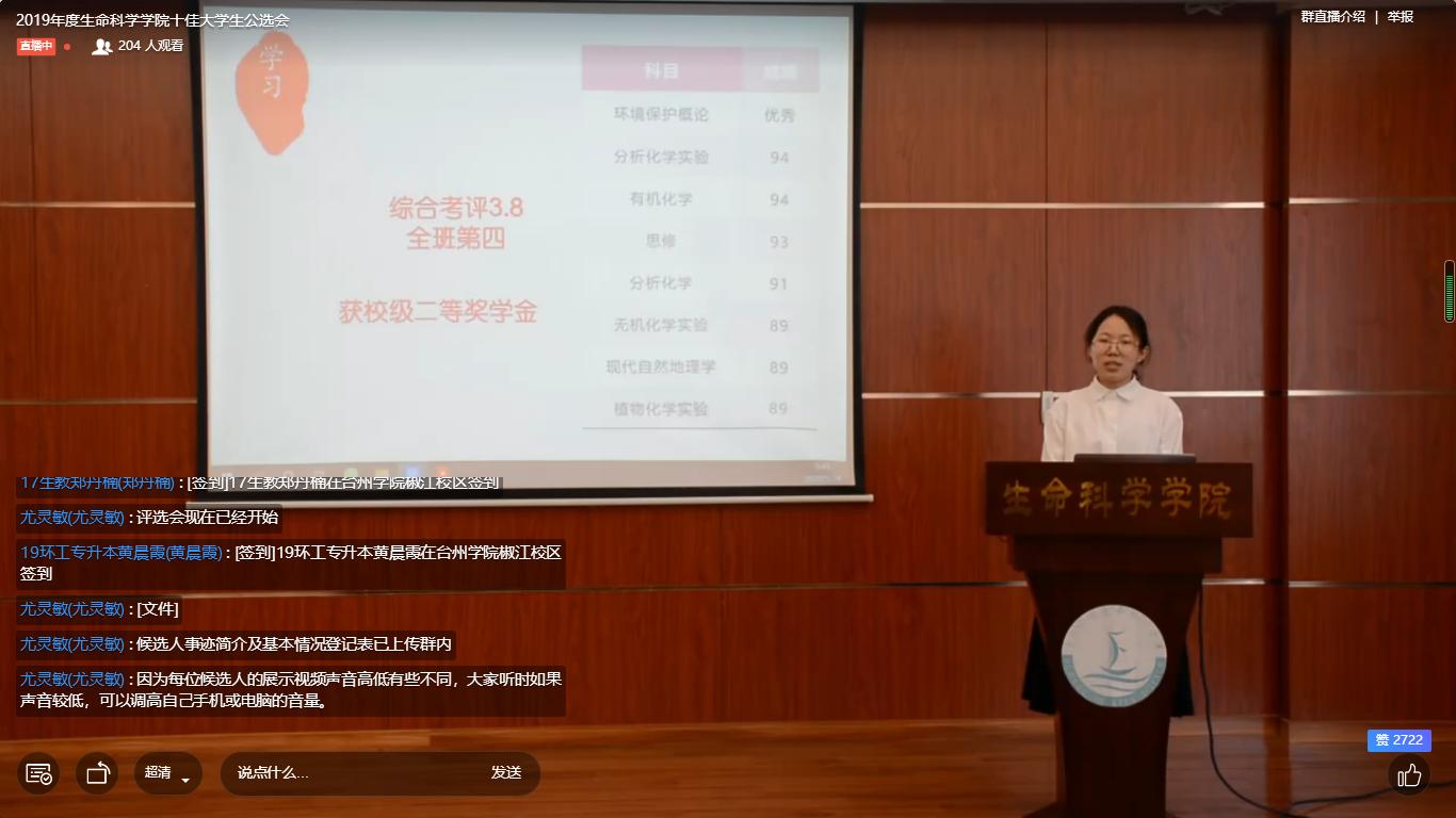 尽管是以“线上”直播的方式开展,但这并不影响10位候选的精彩汇报,10位优秀学子或慷慨激昂、或幽默风趣、或端正严肃,在台上自信展示,讲述各自在学习、工作、生活上的奋斗历程和高光时刻。有的分享丰富的员工干部工作经历,有的阐述自己的学习、科研见解,有的讲述参加志愿活动展现青春风采的故事。他们努力且上进,自律且自由,以执着之心书写青春华章,用自身的经历演绎“道阻且长,行则将至”的真谛。评选会上,候选人妙语连珠,获得了屏幕前各位评审代表的啧啧称赞。最终,综合微信网络投票和公选会现场投票结果,潘苑霞等八位同学当选为2019年度K1体育“十佳老员工”。