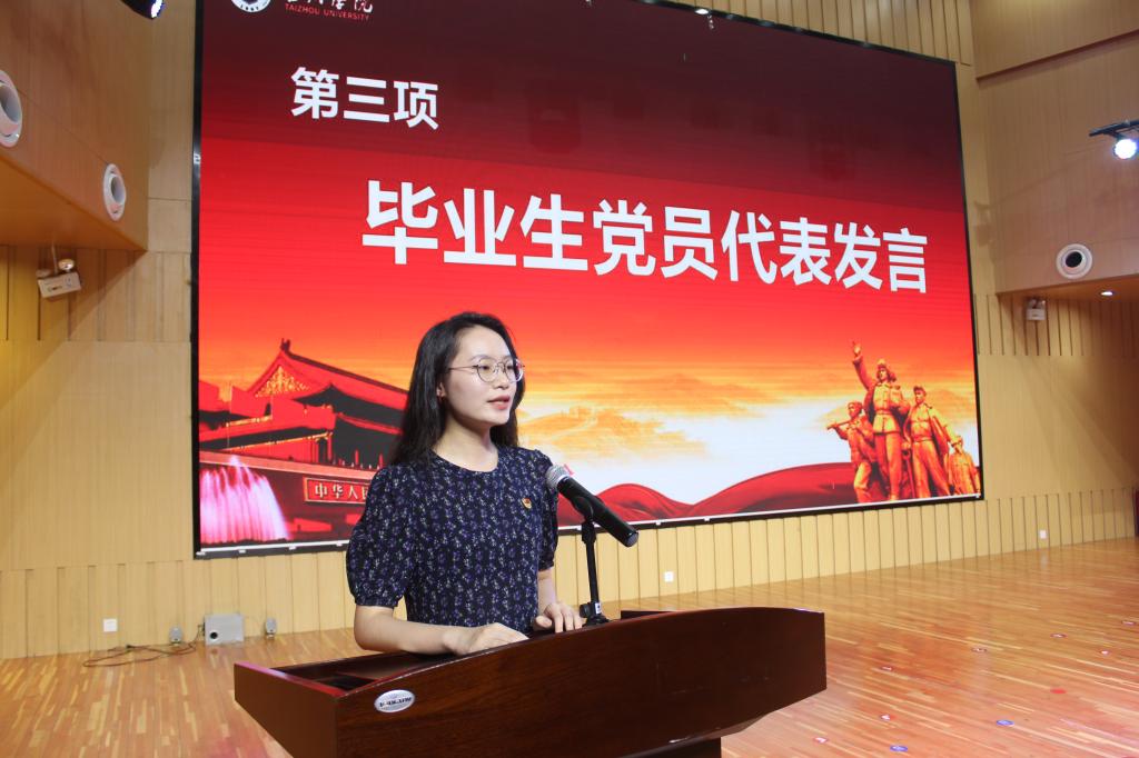 宣誓仪式在雄壮的《国际歌》声中拉开帷幕,柯世省带领全体党员面向鲜红的党旗,高举右手,庄严宣誓,“我志愿加入中国共产党,拥护党的纲领,遵守党的章程……”铿锵有力地声音久久回荡,铮铮誓言重燃了为共产主义奋斗终身的决心。赵旋彤代表毕业生党员发出内心最强音,一定牢记党员身份,不忘初心使命,不负时代责任,不断取得新进步,谋求新作为,展现新担当。
