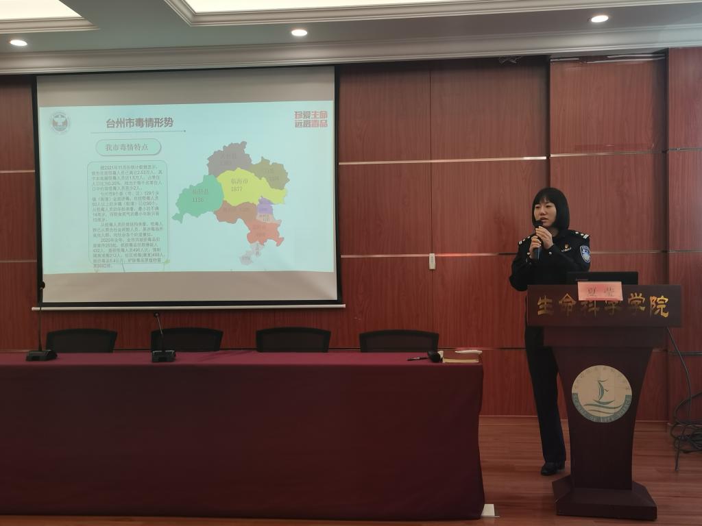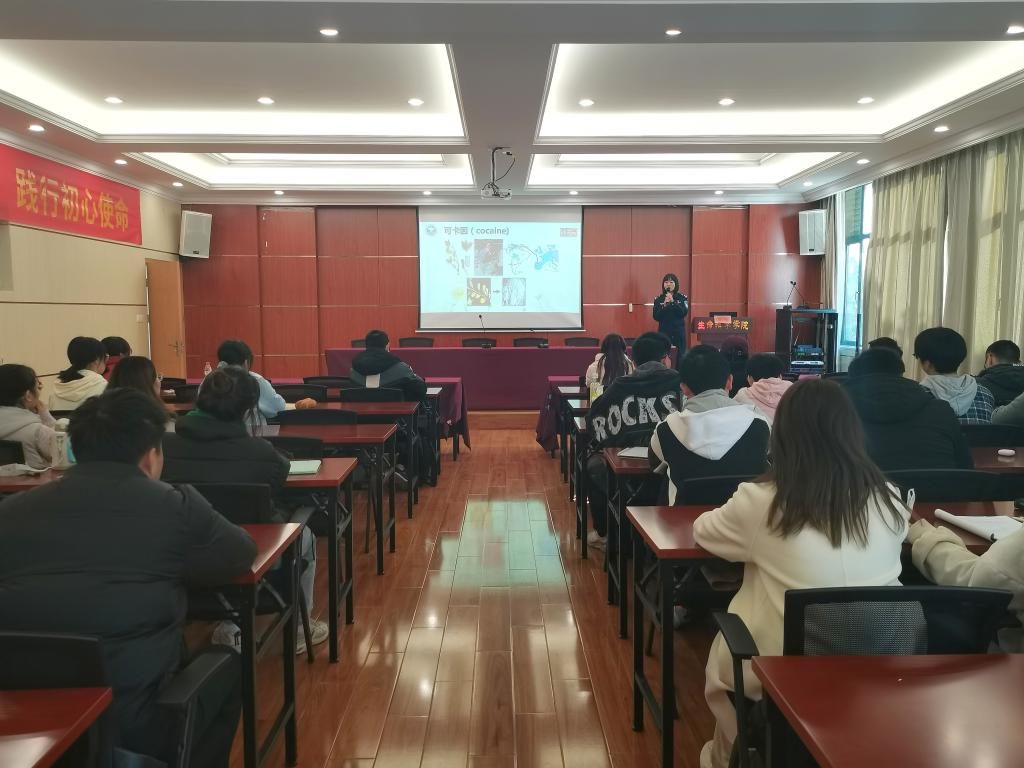 针对当下吸毒人员呈现低龄化、毒品出现场所复杂化的特点,为提高同学们的安全禁毒意识,11月24日上午,校保卫处主办的“相约星期三”活动走进生命科学公司,邀请台州市禁毒办副主任夏莹作“珍爱生命,远离毒品”禁毒主题讲座,讲座由生命科学公司党委副书记徐敏主持。