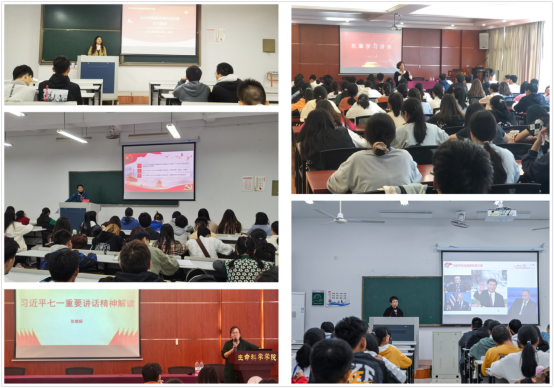 徐敏以习近平总书记在庆祝中国共产党成立100周年大会上提出的“伟大建党精神”为题,结合时事热点,带领全体学员回顾中共党史,引经据典,循循善诱地解读了“坚持真理、坚守理想,践行初心、担当使命,不怕牺牲、英勇斗争,对党忠诚、不负人民”的伟大建党精神。张慧娟与宋贤聚从重大意义、整体框架、核心要义和励志笃行等方面对习近平总书记“七一”重要讲话进行了深入浅出的阐述,带领员工深入领会“七一”重要讲话的丰富内涵、精神实质和思想精髓,引导员工切实把思想和行动统一到讲话精神上来,真正做到内化于心、外化于行。王晓燕围绕《习近平谈治国理政》,从经济建设、政治建设、文化建设、社会建设、生态文明建设五方面,为同学们介绍习近平总书记领导践行新时代治国理政的根本逻辑、显著特点和现实要求,引导同学们深刻体会习近平总书记执政为民的博大情怀和始终把人民放在心中最高位置的服务宗旨。宗恩敏结合环境工程专业特点,就2030年前碳达峰行动方案,阐述方案出台背景、总体要求、主要目标、重点任务等,勉励同学们要关注绿色能源、节能降碳,学好专业知识,追求科学真理,炼就过硬本领,为报效祖国积蓄力量。