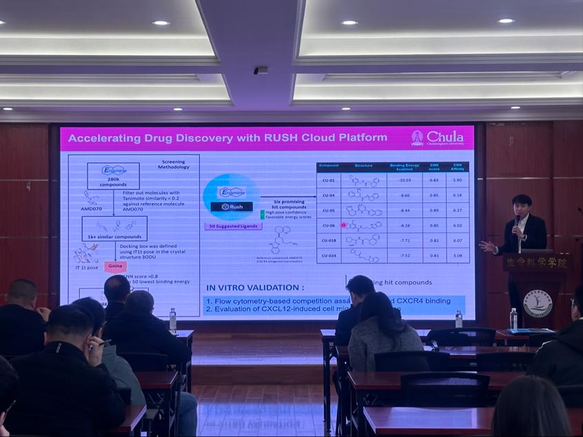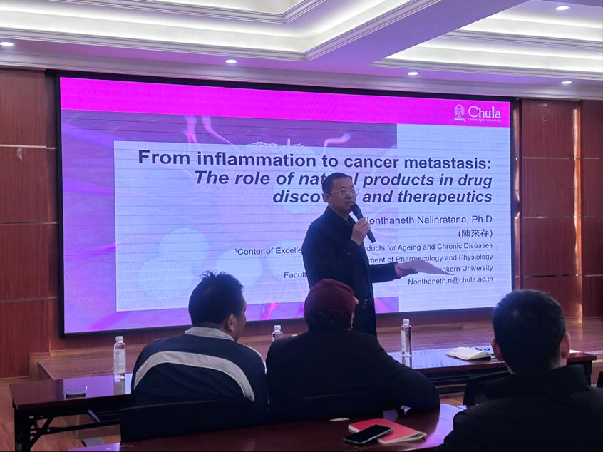 本次报告围绕炎症在癌症发生、发展和转移中的作用以及天然产物在药物开发中的潜力展开,包含以下三个部分:(1)炎症在肿瘤发生中的作用机制;(2)天然产物在抗炎和抗癌药物开发中的优势与应用;(3)基于天然产物的新型药物研发策略与实例。报告内容涵盖了Nonthaneth Nalinratana所在团队的研究成果以及最新进展,对天然产物在药物开发中的研究具有重要的指导意义。会后,与会师生和Nonthaneth Nalinratana博士就感兴趣的问题进行了深入的交流和讨论。