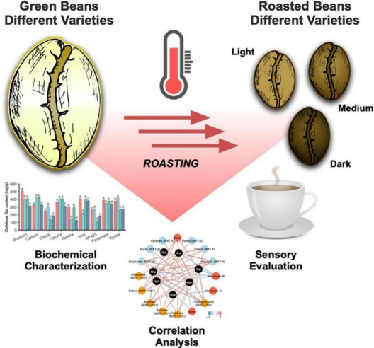 为此,本研究聚焦咖啡多糖,对九种代表性阿拉比卡咖啡豆及其不同烘焙程度进行了系统的多糖成分分析(涵盖咖啡豆、咖啡液及咖啡渣三种材料)。多维数据集清晰揭示了品种间的显著差异以及烘焙程度对多糖特征的深刻影响。研究解析了多糖组成与咖啡感官特性之间的关联机制,发现咖啡豆与冲泡液中的多糖组成均与杯测特性密切相关,且呈现非线性烘焙度依赖的变化模式。这些结果为咖啡生产链的多糖组成提供了全景式描绘,并为理解咖啡品质的化学基础开辟了新视角。