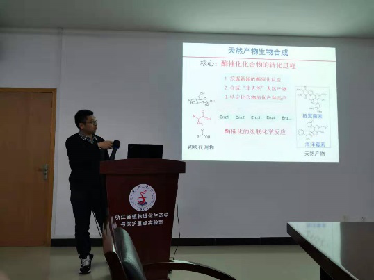 首先林教授深入浅出的介绍了他课题组在微生物生物碱的生物合成领域开展的一些开创性的工作,通过克隆一系列含有b-甲基色氨酸的吲哚生物碱如抗肿瘤药物链黑菌素、淡紫醌霉素、Maremycin、FR-900452等的生物合成基因簇,进一步通过体外酶学和结构生物学技术阐明了(2S, 3S)- 和 (2S, 3R)- b-甲基色氨酸立体选择性生物合成的酶催化反应机制、b-咔啉生物碱的酶催化合成机制、2-氧吲哚单元的酶催化合成机制等。同时结合新发现特性及酶催化反应,通过生物合成途径组装,获得了一系列链黑菌素的高活性低毒性的衍生物,为理论研究到应用提供了新思路。