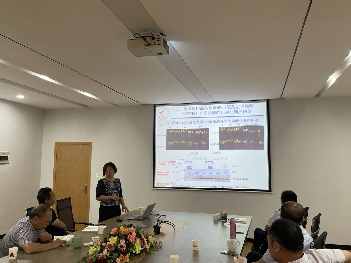 李海英教授做了题为“甜菜M14品系优质基因资源的挖掘与耐盐功能研究”的学术报告。报告中李教授在简要介绍甜菜M14品系后,具体阐述了通过组学技术挖掘甜菜M14品系重要基因及蛋白资源的研究,最后阐述了甜菜M14品系丝氨酸/苏氨酸蛋白激酶(STPK)介导的磷酸化耐盐调控网络和甜菜M14品系高效活性氧(ROS)清除及甲基乙二醛(MG)解毒调节机制。