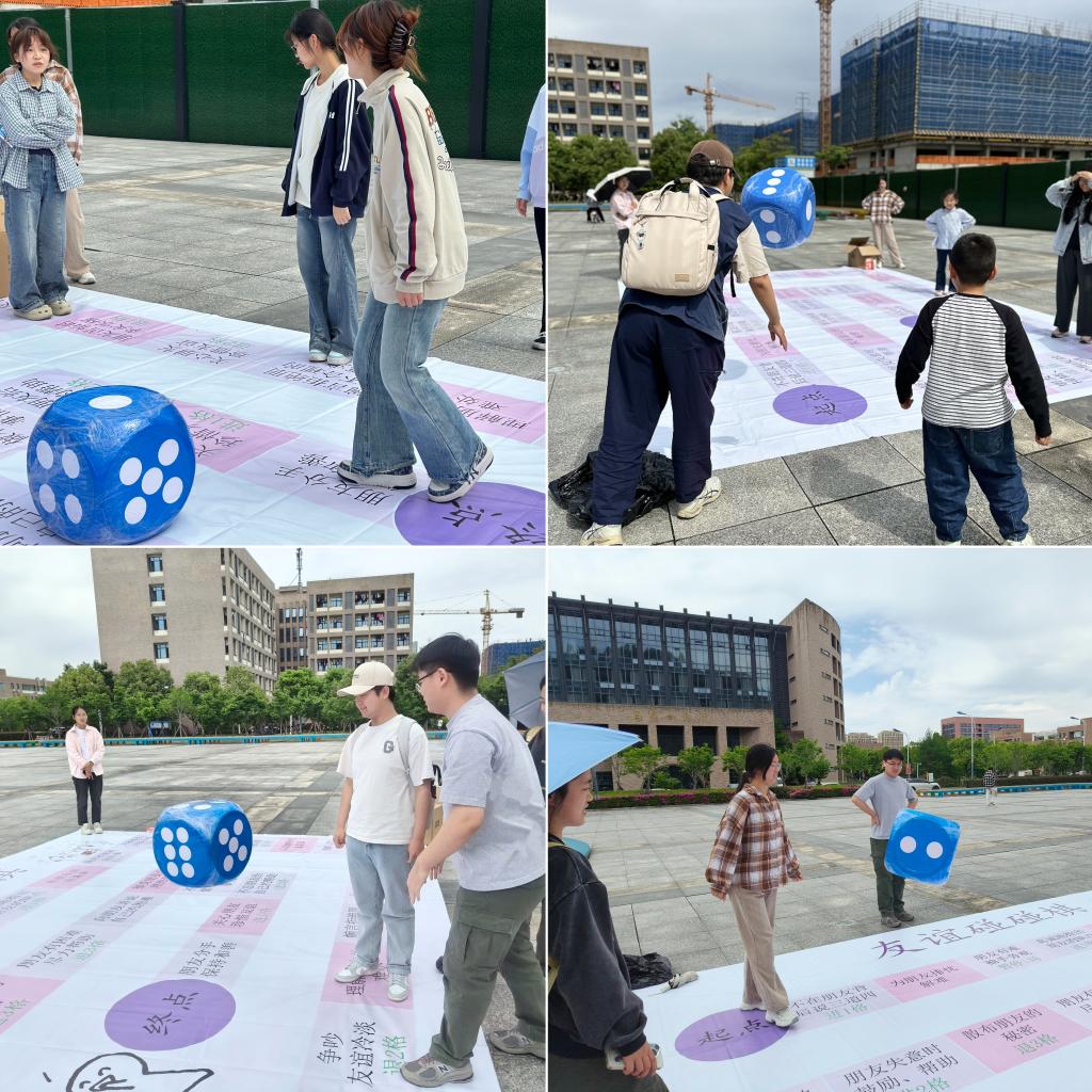 活动现场,友谊主题的大棋盘铺展于地,色彩鲜艳的骰子更是吸睛。参赛同学两人一组,一人化身投骰子的“指挥官”,凭借手气决定前进格数;一人充当 “棋子”,在棋盘上跳动挪移。大家全情投入,每一步选择都充满默契与思考,现场欢声笑语不断,同学们不仅收获了游戏的快乐,更在互动协作中加深了彼此情谊。