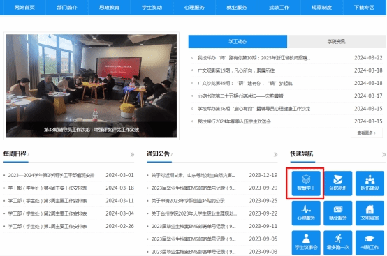 1.进入“K1体育学工部”首页(https://xsc.tzc.edu.cn/),在“快速导航”栏点击“智慧学工”。