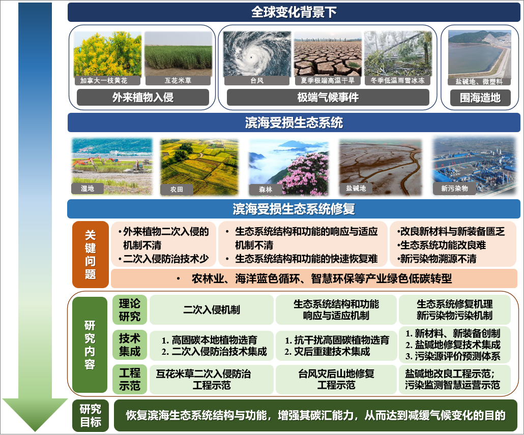入侵生态系统修复:针对外来植物二次入侵机制不清、修复技术不足等问题,以滨海湿地(滩涂)和农田为研究对象,阐明全球气候变化背景下互花米草、加拿大一枝黄花、空心莲子草等二次入侵机制及对本地植物生长的反馈;建立卫星遥感监测技术,集成土壤微生物改良菌剂、植物源抑菌剂、高固碳本地物种替代等二次入侵防治修复技术。尤其针对互花米草二次入侵,集成以无人机精准灭除、耐冷红树林替代等策略为主的防控技术体系,建立工程示范并推广。