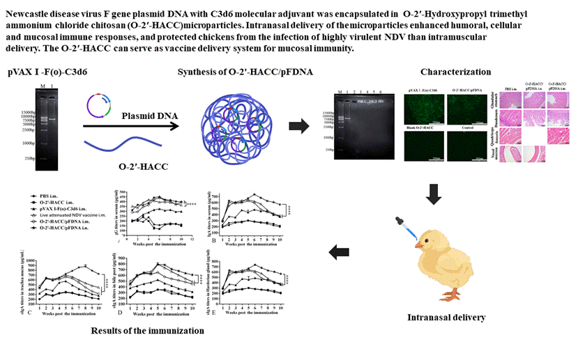 疫苗在防治人及动物传染病中起到了重要作用,但目前动物用疫苗存在免疫原性差、抗原生物利用度低、细胞免疫效果不佳、非黏膜免疫、疫苗佐剂安全性差或者效果不明显等问题。天然多糖壳聚糖纳米载体材料做为疫苗佐剂及递送载体已有报道,但壳聚糖在许多溶剂中不溶解,这在很大程度上限制了其应用范围。本团队对壳聚糖进行了化学改性,合成了水溶性好的O-2′-羟丙基三甲基氯化铵壳聚糖(O-2′-HACC)。本论文以O-2′-HACC为疫苗黏...